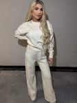 Komplet dzianinowy na zdjęciach składa się z eleganckiej kremowej bluzy oraz dopasowanych spodni z szerokimi nogawkami. Przód kompletu jest zdobiony błyszczącymi elementami, co nadaje całości wyjątkowego charakteru. Spodnie są komfortowe, z luźnym fasonem, co sprawia, że zestaw jest zarówno stylowy, jak i wygodny.